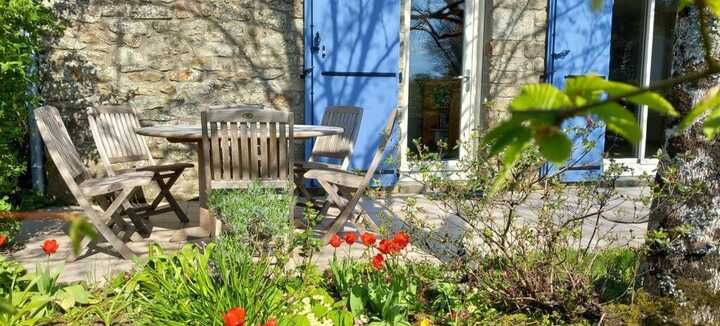 Dieser alte, restaurierte Bauernhof im Pays d'Auray liegt in einem ruhigen kleinen Weiler, das Haus ist dem Wald zugewandt.