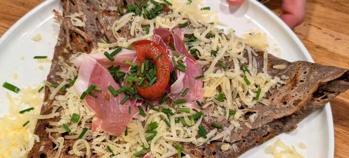 Die traditionelle und gemütliche Crêperie zelebriert die Authentizität der handwerklich hergestellten bretonischen Galette, die aus 100% Buchweizenmehl IGP Bretagne von Hand gedreht und für eine einzigartige Textur beidseitig gebacken wird.